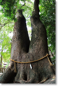 もとは二本の楠がいつしか根を合わせて一株に成長したもので、伊弉諾 伊弉冉二神の御神霊の宿る御神木として夫婦円満、安産子授、縁結びなどの信仰で崇められています。